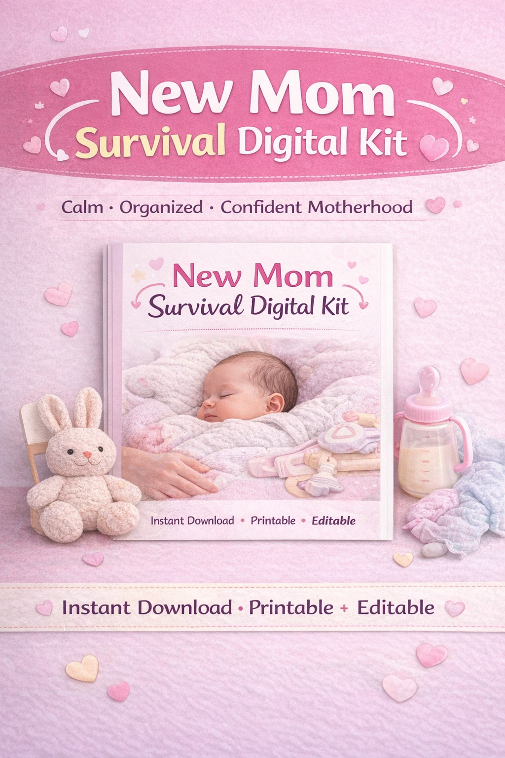 The New Mom Digital Survival Kit gives you instant support with calming routines, baby trackers, sleep schedules, and emergency guides — all in one beautiful editable digital bundle.