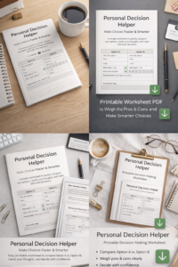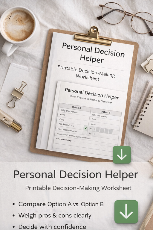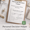 Personal Decision Helper is a premium printable worksheet created to help you step out of confusion and make decisions with confidence and calm.
